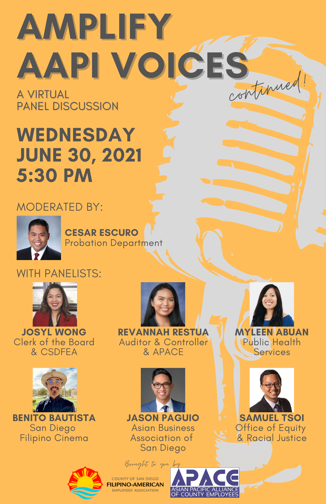 The County of San Diego Filipino American Employees Association (CSDFEA) and Asian Pacific Alliance of County Employees (APACE) will host a second virtual panel of Amplify AAPI Voices on Wednesday, June 30, from 5:30 to 7 p.m.