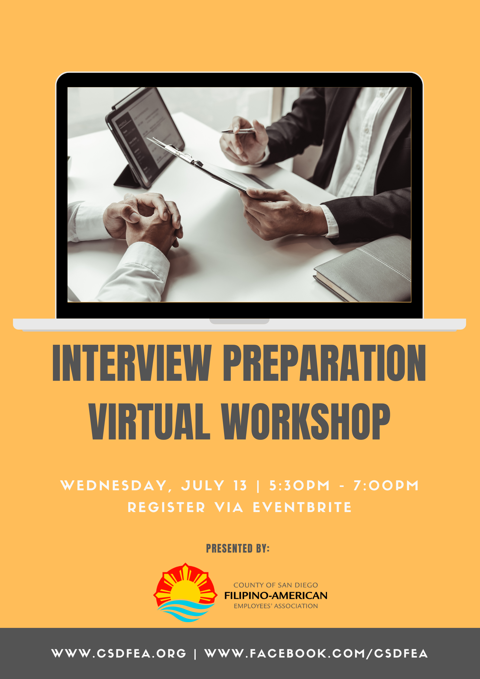 The County of San Diego Filipino American Employees’ Association is hosting an Administrative Analyst Interview Preparation workshop at 5:30 p.m., July 13. Learn about how to approach common interview questions and how to prepare for both in-person and virtual interview settings.