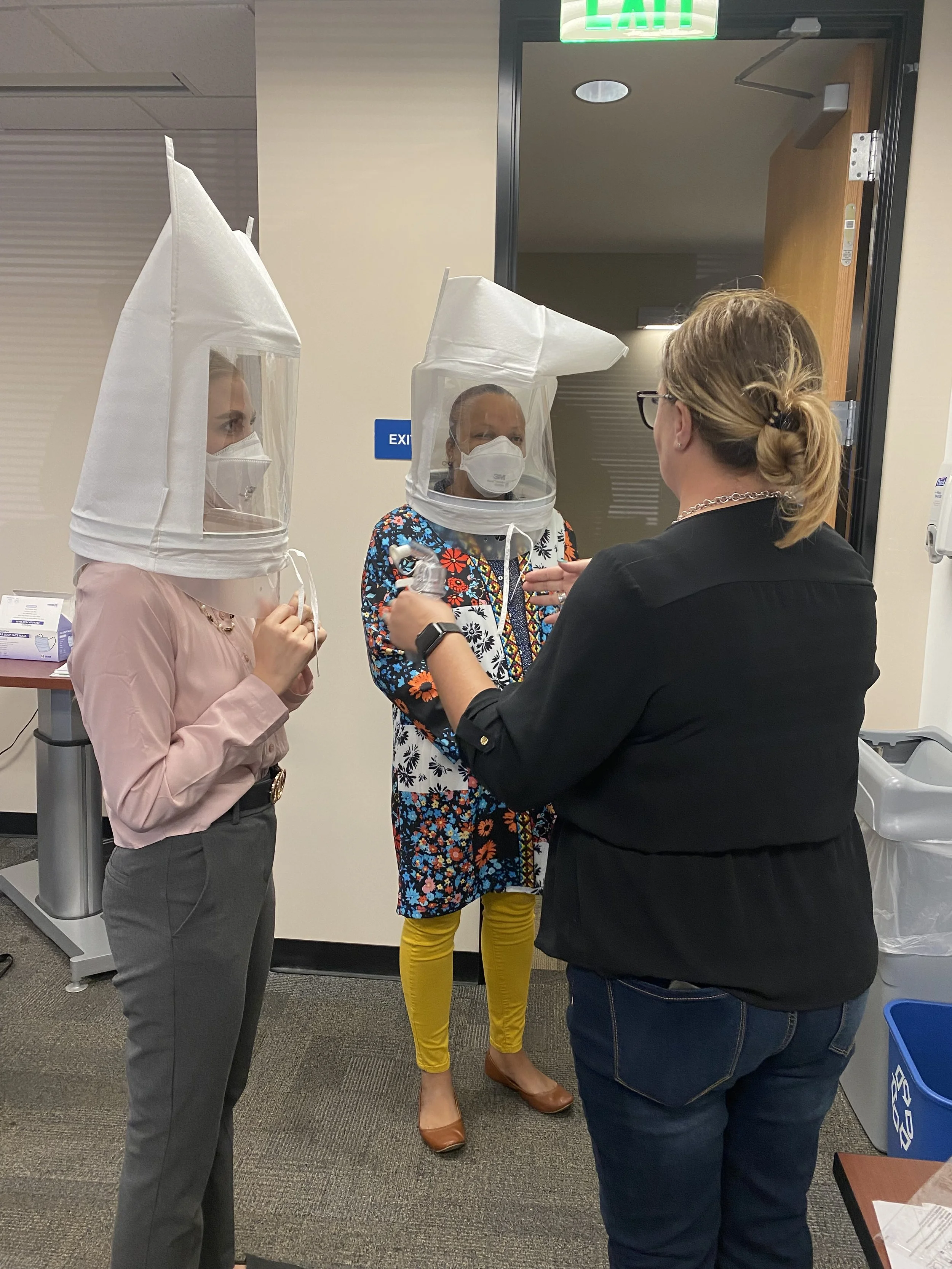 In this photo, submitted by County staff nurse Takisha “Shaun” Murry, she and her coworker Mischa Joy Denton are getting a fit test by Crystal Delgado. Murry is in the Public Health Residency program.